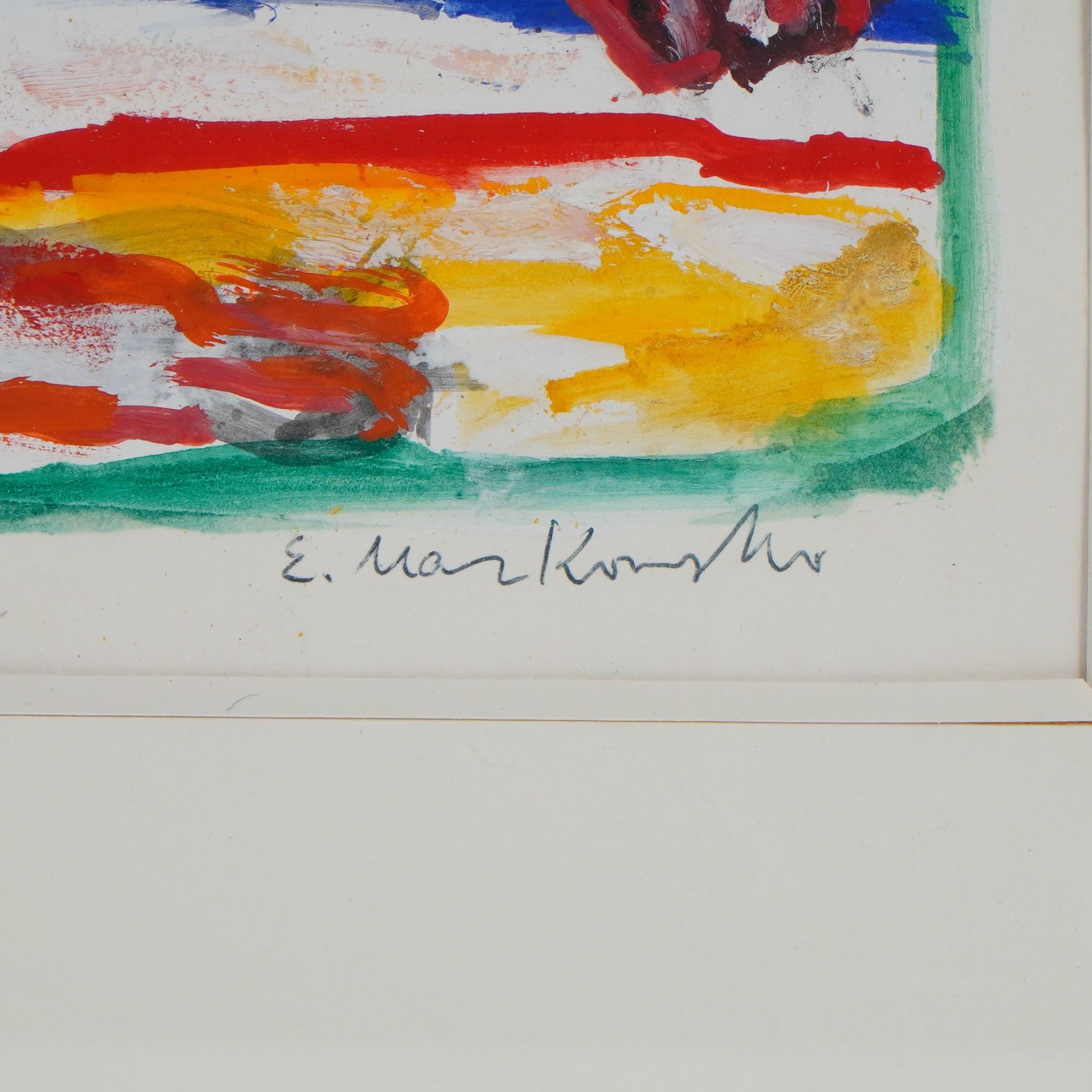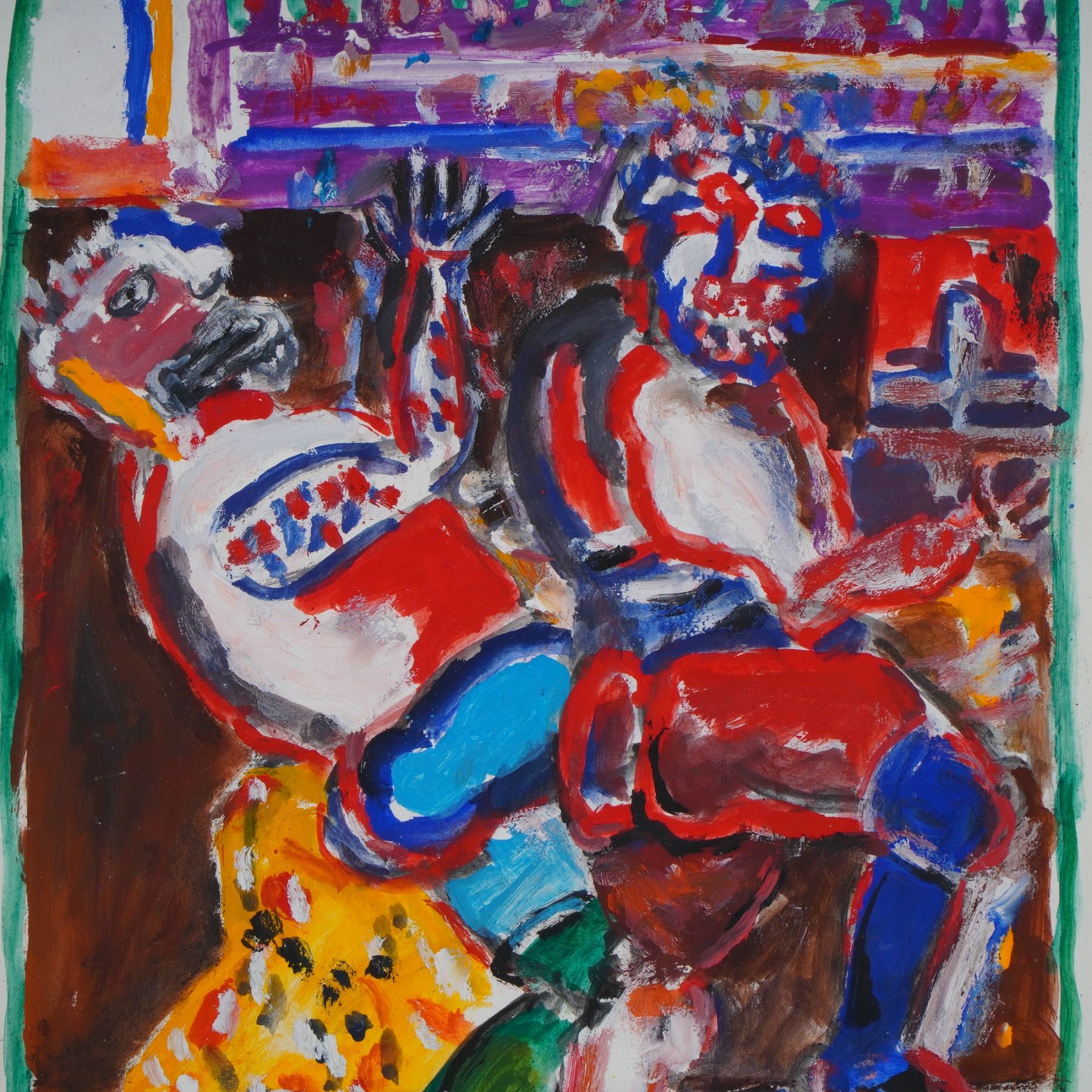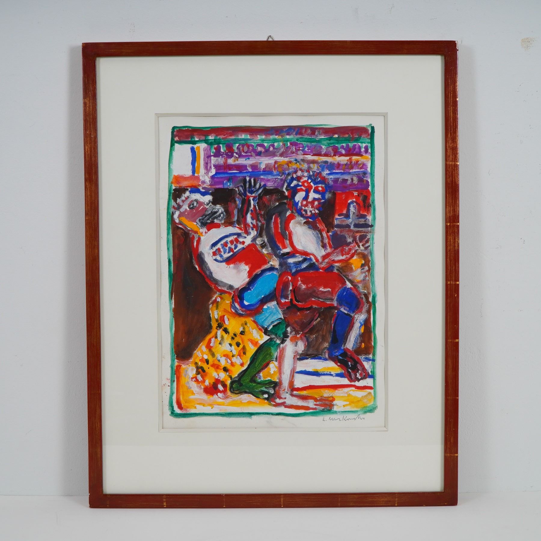 A vibrant and dynamic composition by Polish artist Eugeniusz Markowski, executed in gouache on paper, capturing his signature expressionist energy and bold use of color. Markowski's work is characterized by a dramatic, almost theatrical sense of movement and emotion, where distorted figures and intense hues evoke both tension and vitality. This piece exemplifies his fascination with the human form and the psychological depth of his subjects, rendered through thick, gestural brushstrokes and vivid chromatic contrasts of red, blue, and yellow. The work is signed lower right in graphite.
