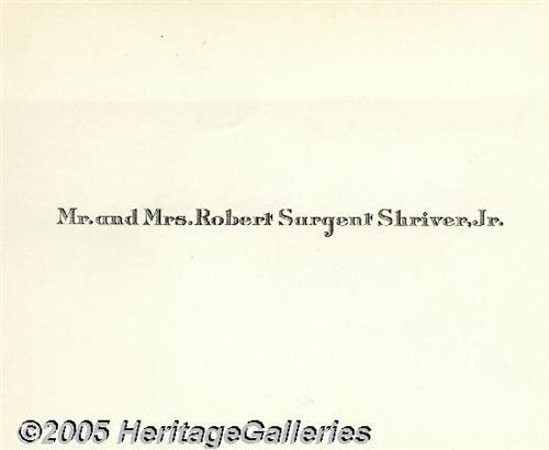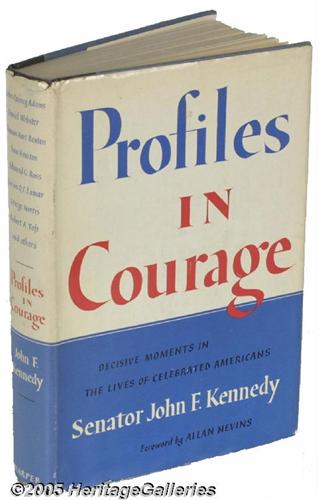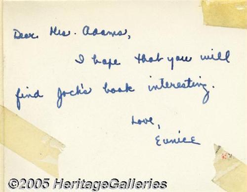 <B>Eunice Shriver Signs JFK's Book <I>Profiles in Courage</B></I></B></I> John F. Kennedy's book, <I>Profiles in Courage</B></I> (New York: Harper & Brothers, 1956) 266 pages, First Edition, 2nd State, with original dust jacket. With a card affixed to the front flyleaf signed and inscribed by Eunice Kennedy Shriver: "Dear Mrs Adams, I hope that you will find Jack's book interesting. Love Eunice". Measures 6" x 8.5". Light rubbing to top and bottom of jacket, pages very clean. <I>Accompanied by COA from PSA/DNA.</B></I>