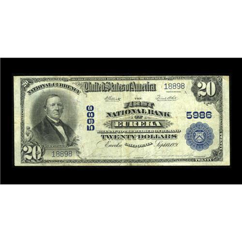 <B>Eureka, CA</B></I> - $20 1902 Plain Back Fr. 660 <B>The First NB</B></I> Ch. # 5986<BR>A <B>Fine-Very Fine</B></I> example of a far less frequently seen denomination from here.<BR><BR><b>Shipping:</b> Coin/Currency (<a target="_blank" href="http://www.heritageauctions.com/common/shipping.php">view shipping information</a>)