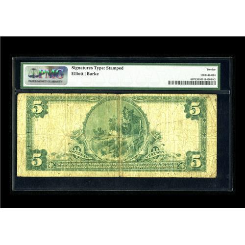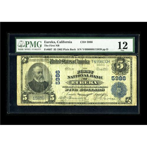 <B>Eureka, CA</B></I> - $5 1902 Plain Back Fr. 607 <B>The First NB</B></I> Ch. # 5986<BR>A <B>PMG Fine 12</B></I> note with the stamped signatures still intact.<BR><BR><b>Shipping:</b> Coin/Currency (<a target="_blank" href="http://www.heritageauctions.com/common/shipping.php">view shipping information</a>)