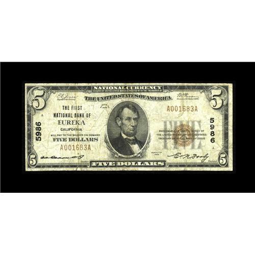 <B>Eureka, CA</B></I> - $5 1929 Ty. 1 <B>The First NB</B></I> Ch. # 5986<BR>A <B>Fine+</B></I> note free from any distractions other than honest circulation indications. A sought after location in Humboldt County likely to sell for no less than...<BR><BR><b>Shipping:</b> Coin/Currency (<a target="_blank" href="http://www.heritageauctions.com/common/shipping.php">view shipping information</a>)