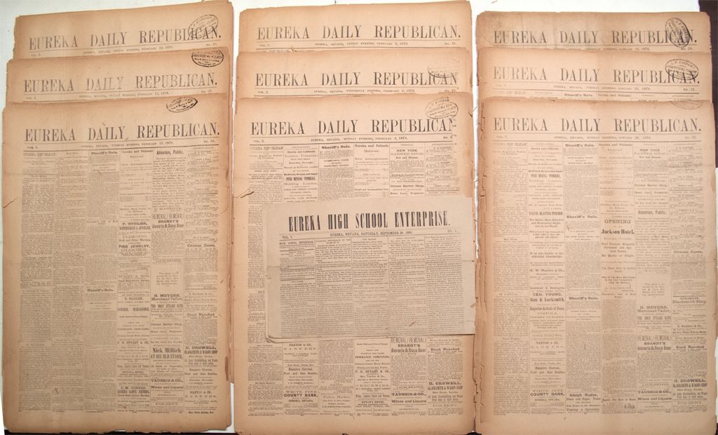 Learn the news of the day through these volumes: Camp Bidwell, Eureka & Palisade ads, news of Belleville, Austin, Tuscarora, etc. Includes the Eureka High School Enterprise of September 26, 1896 as a bonus. As with all old newspapers the paper is very fragile, but the historical value in articles and advertising is tremendous. Due to size, additional shipping fees may be required.
