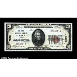 Eureka, KS - $20 1929 Ty. 1 The Home NB Ch. # 7303An attractive example from the scarcer of the two banks to issue small notes here. The Kelly census lists seven pieces from this bank's meager issue. Choice About Uncirculated. Important notice: We expect to be auctioning lots at the rate of 200-250 per hour. Sometimes eBay Premier live bid software cannot keep up with that pace, so we strongly recommend that you place a realistic proxy bid now as insurance to avoid disappointment. Also please note that all Heritage/CAA lots purchased through eBay Premier carry a 20% Buyer's Premium. Please make sure you read the Terms and Conditions.