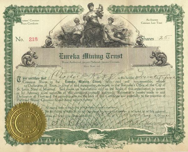1922, Missouri. Stock certificate for 25 shares. Green/Black with gold seal. Vignette of triple allegorical figure at top center. Uncancelled. Very fine.