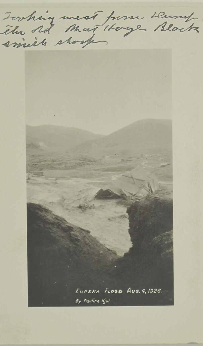 An rpc taken by Pauline Hjul and showing floodwaters rushing past the rise she was standing on, with a demolished building just across the water. A handwritten note on the face reads, “Looking west from Dump (?) to the old Mat Hayes Blacksmith shop.”