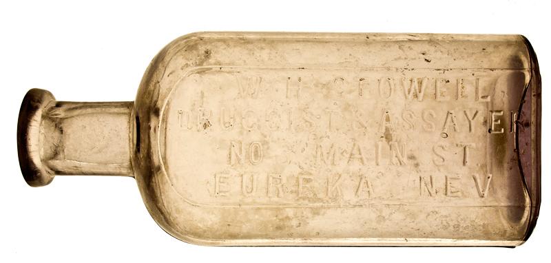 Rare embossed light purple, 5" drug store bottle for W. H. Stowell "Druggest and Assayer". Stowell was a prominent Assayer and Druggest in Eureka, the heart of silver country in central Nevada. While he ran a drug store, he was also extremely active in the mining business and remained so his entire life. Stowell's business for a long time was the sole independent assay house in Eureka. In later years he moved to Spokane and continued his business there until he died. Mint with minor stain on the back side. This is the only US embossed bottle from an assay office.