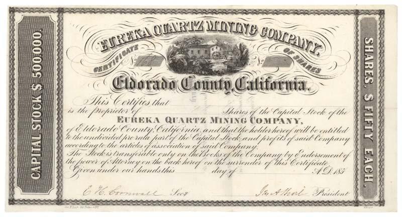 185-, California. Unissued stock certificate, signed by both officers. Black. Vignette of a mining camp at top center. Uncancelled and fine.