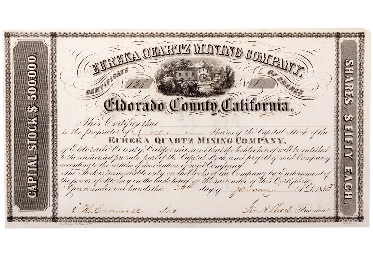 c1853 Eureka Quartz Mining Company stock certificate, No. 128, for one share of capital stock. The issuee line is blank, but the stock is dated 24 January 1853. Signed by E.H. Cornwall, secretary, and James A. Shorb, president. Measures 11" x 6". Vignette of mill and miners top center. Uncancelled. VF. The Eureka Quartz Mining Company was likely operating in Georgetown, California. There was a second Eureka Mine in Placerville, but it was not active until decades later. The Eureka quartz mine at Georgetown had a 130-foot deep shaft in 1867. It was located immediately north of the Woodside on the same quartz vein, which was about two feet wide. They had a steam hoist, but no mill. The vein had a NE-SW strike and easterly dip averaging about $30 per ton, according to J. Ross Browne in Mineral Resources West of the Rocky Mountains, 1868. By 1882, the mine was 230 feet deep, inactive, and full of water, according to the History of El Dorado County, 1883. This is quite possibly the earliest known lode mining company stock certificate extant. Condition is excellent. - HKA#63995
