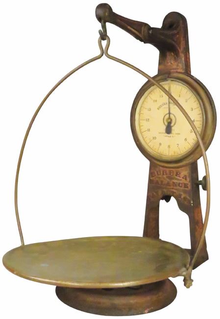 Eureka Scale Co. Balance Scale. Patent Oct. 1869. Cast iron base with original brass pan. Good original condition. 7 1/2 X 18 X 12 w/o pan.