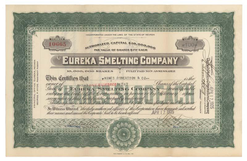 1925, Nevada. Stock certificate for 100 shares. Green/Black. Folds. Uncancelled and fine.