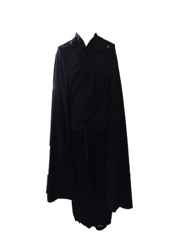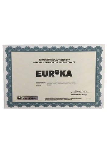 Douglas Fargo (Neil Grayson) screen worn, hero, black cape with buttons on borh sides and rope tie, black"Venus & Mars" shirt costume style with lace up the front (sm), black "Levis"pants with stirrups sewn on the bottom of the leg.(31x30),black leather 4 inch thick belt that laces up. Certificate of authenticity included. Eureka is an American science fiction television series that premiered on Sci-Fi Channel on July 18, 2006. The fifth and final season ended on July 16, 2012. The show is set in the fictional town of Eureka, Oregon Most residents of Eureka are scientific geniuses who work for Global Dynamics – an advanced research facility responsible for the development of nearly all major technological breakthroughs since its inception. Each episode featured a mysterious accidental or intentional misuse of technology, which the town sheriff, Jack Carter, solved with the help of town scientists.