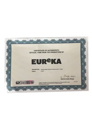 Screen worn, red "Gildan" "Drink the Right Stuff" t-shirt (xl). Certificate of authenticity included. Eureka is an American science fiction television series that premiered on Sci-Fi Channel on July 18, 2006. The fifth and final season ended on July 16, 2012. The show is set in the fictional town of Eureka, Oregon Most residents of Eureka are scientific geniuses who work for Global Dynamics – an advanced research facility responsible for the development of nearly all major technological breakthroughs since its inception. Each episode featured a mysterious accidental or intentional misuse of technology, which the town sheriff, Jack Carter, solved with the help of town scientists.