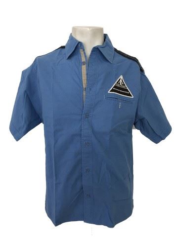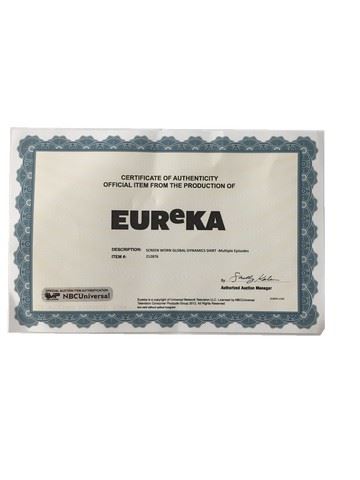 Screen worn, "Global Dynamics Maintenance" blue shirt (m), worn in multiple episodes. Certificate of authenticity included.