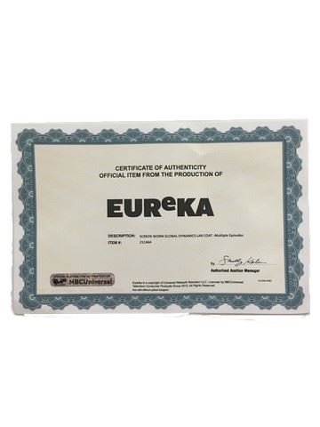 Screen worn, off white "Global Dynamics" lab coat. Certificate of Authenticity included. Eureka is an American science fiction television series that premiered on Sci-Fi Channel on July 18, 2006. The fifth and final season ended on July 16, 2012. The show is set in the fictional town of Eureka, Oregon Most residents of Eureka are scientific geniuses who work for Global Dynamics – an advanced research facility responsible for the development of nearly all major technological breakthroughs since its inception. Each episode featured a mysterious accidental or intentional misuse of technology, which the town sheriff, Jack Carter, solved with the help of town scientists.
