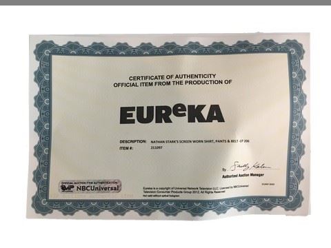 Nathan Stark (Ed Quinn) screen worn, hero, cream "Venus & Mars" pirate style costume shirt with lace up the front detail (sm), black costume style pants with stirrups sewn on the bottom of the pant leg. Certificate of authenticity included. Worn in scene 206.