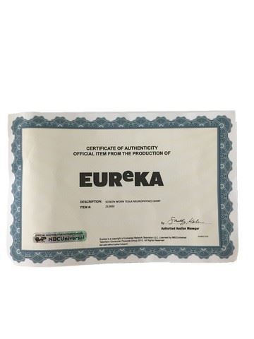 Screen worn, white "Gildan" polo shirt "Tesla School Neurophysics Department"(lg). Certificate of Authenticity included.