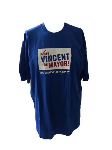 Screen worn, blue "Gildan" t-shirt that says "Vote Vincent For Mayor, You Want, He's Got It". (xxl). Certificate of Aunthenticity Included.