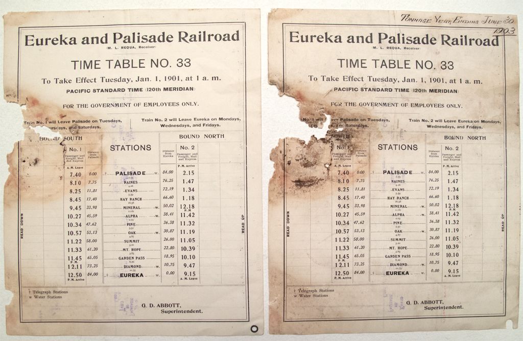With stops in Raines, Evans, Hay Ranch, Mineral, Alpha, Pine, Oak, Summit, Mt. Hope, Garden Pass, and Diamond. 84 miles in 5 hours! The middle right has been torn and some of the time table is missing. Please see photo.