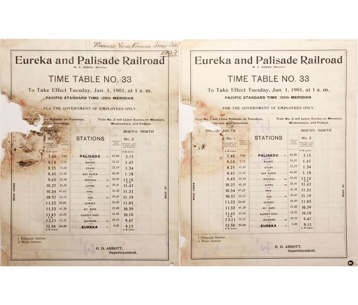 A rare Eureka and Palisade Railroad time table. The upper left side is heavily damaged, holed, and stained. The rest of the document shows typical foxing. The railroad was narrow gauge, constructed in 1873-1875 between Palisade and Eureka, NV, a distance of approximately 85 miles. The railroad was constructed to connect Eureka, the center of a rich silver mining area, with the national railway network at Palisade. The company closed in 1938. -58802
