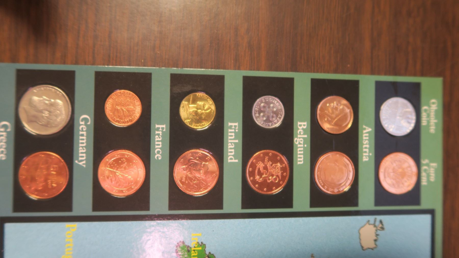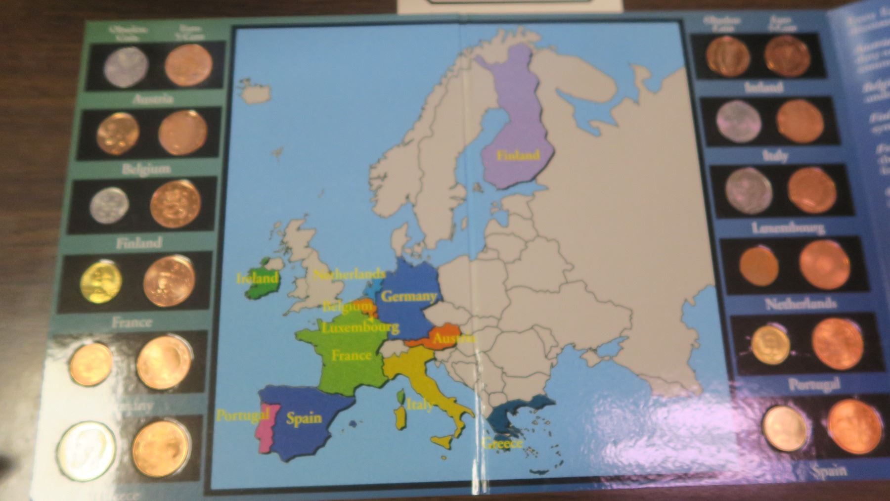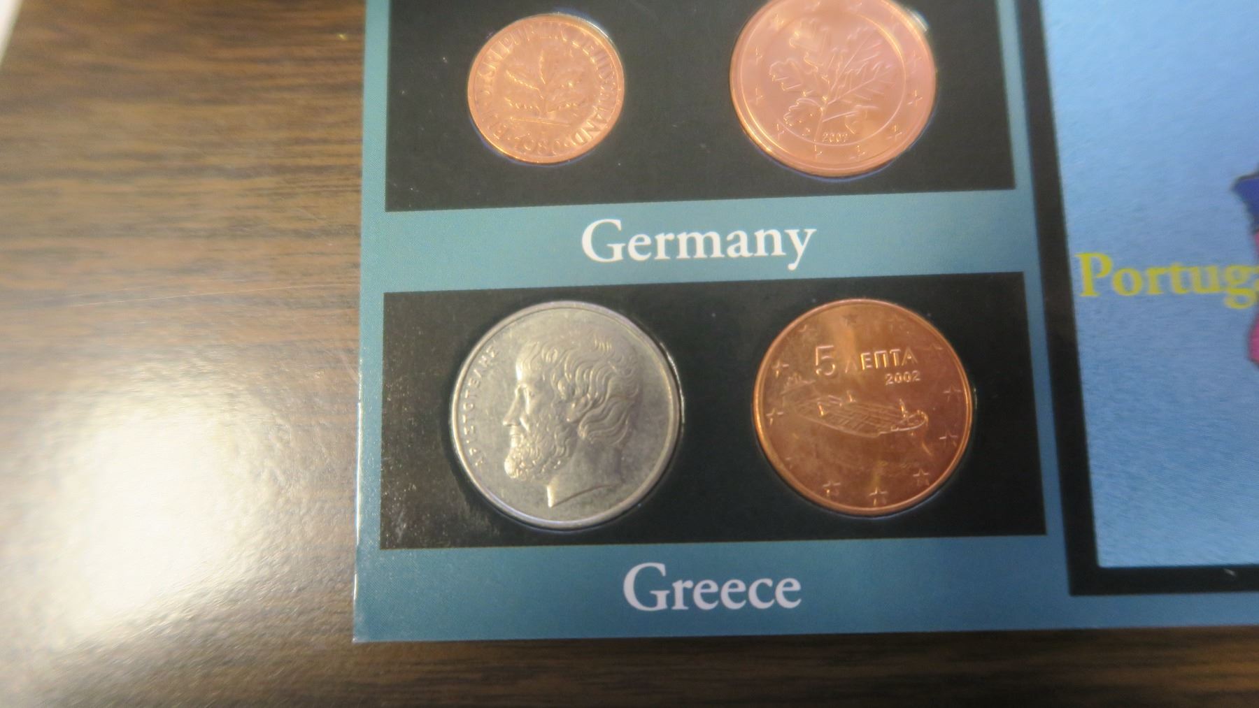 Euro Coin Collection. Complete 24-coin set includes obsolete coins and new Euro coins from Austria, Belgium, Finland, France, Germany, Greece, Ireland, Italy, Luxembourg, Netherlands, Portugal & Spain. Housed in a folder from First Commemorative Mint. All coins Uncirculated.