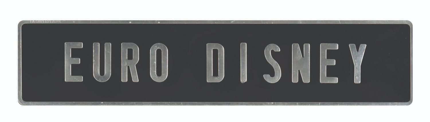 (Disneyland Paris, 1992) A Park-used European format license plate from the grand opening festivities at Euro Disney in 1992. The star studded grand opening ceremonies were broadcast internationally as a television special and featured processions of celebrities, Disney luminaries, and beloved characters. This plate adorned a car during the ceremony. The stately stamped metal license plate was produced by French manufacturer La Superplaque and features a black enamel fill. Measuring 4"x18", the piece is in very good condition with minimal wear.