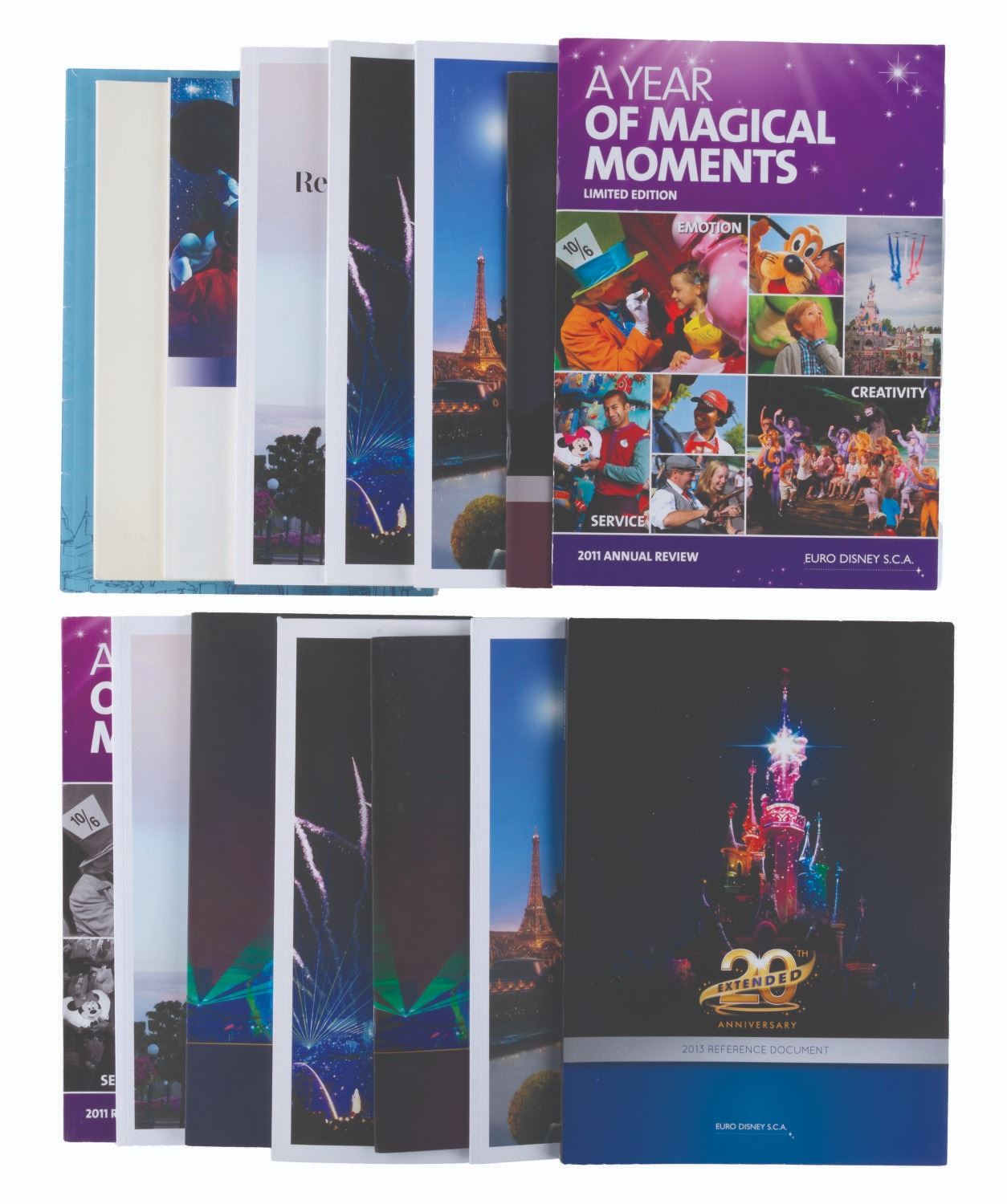 (Disney, 2001-2016) A large collection of fifteen annual reports, financial reports, and reference documents from the Oriental Land Co. and Euro Disney. Ranging in size from 8.25” x 11.75” to 8.5” x 11”, the booklets are in good to very good condition with creases, surface scratches, and edge wear from use.