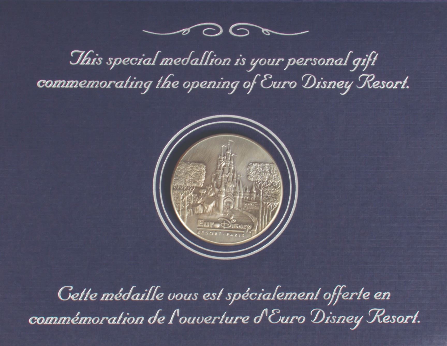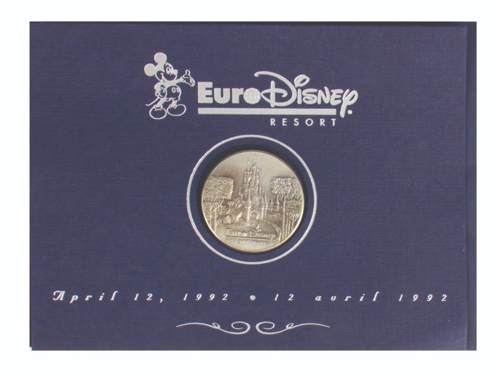 (Disneyland Paris, 1992) A very rare medallion given to Disneyland and Walt Disney World employees to commemorate the Grand Opening of Disneyland Paris on April 7, 1992. This medallion comes displayed within a thick card backing and includes its original envelope and employee letter from Judson Greeb regarding the opening of the new park. The medallion measures 1.75" in diameter and the set is in very good condition.