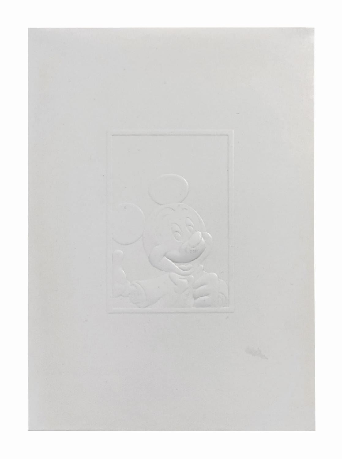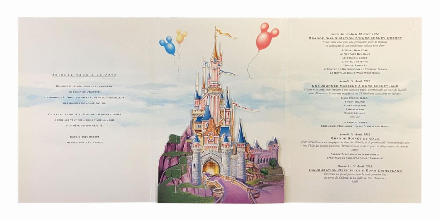 (Disneyland Paris, 1992) A special invitation exclusively sent to press, dignitaries, and VIPs for the grand opening festivities at the Euro Disney Resort on April 10-12, 1992. The elegant trifold invitation features an embossed white-on-white portrait of Mickey Mouse on the front cover and an embossed Euro Disney logo on the reverse. The contents include an intricate die-cut model inspired by concept art for the Parisian Sleeping Beauty Castle and a list of various events and ceremonies taking place as part of the opening celebrations. Measuring 8.25"x6", the invitation is in very good condition with some faint dark adhesive residue to the cover and a light brown scuff to the reverse.