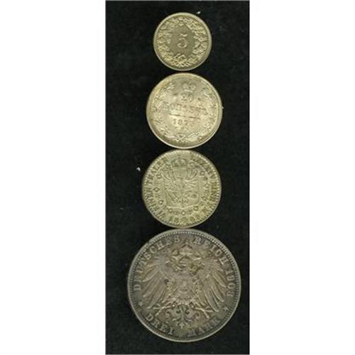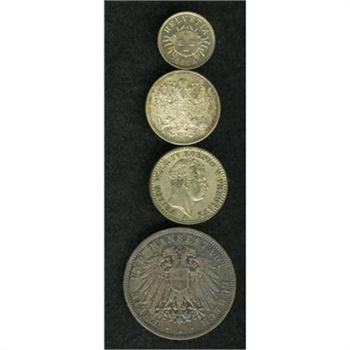 <B>Euro mixture:</B></I> Lubeck 3 Mark 1908-A toned XF; Prussia 1/6 Taler 1849-A toned XF; Russia 20 Kopecks 1873 toned UNC; Switzerland 5 Rappen 1874 toned UNC, a charming piece.<BR><BR><b>Shipping:</b> Coin/Currency (<a target="_blank" href="http://www.heritageauctions.com/common/shipping.php">view shipping information</a>)