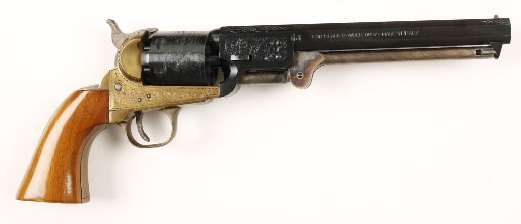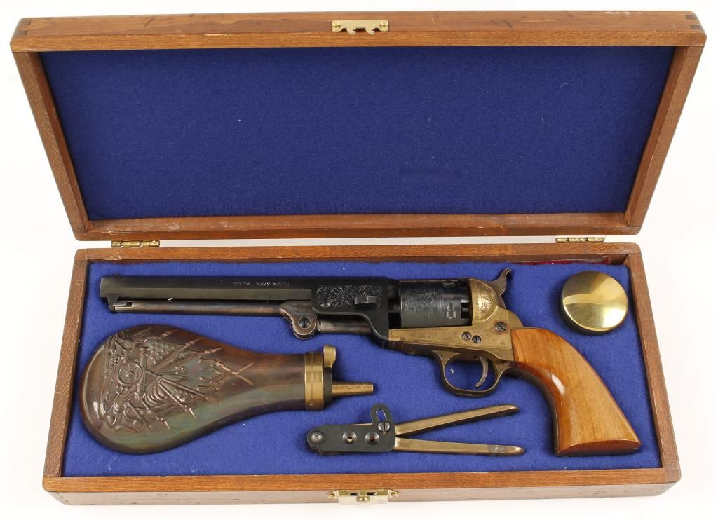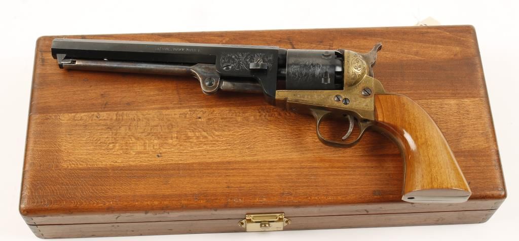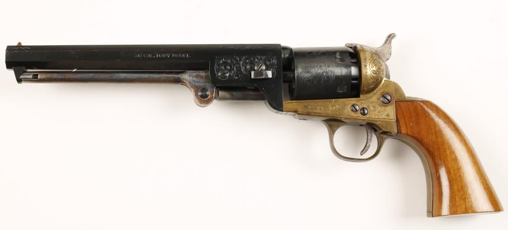 Cased engraved replica black powder single action 6-shot percussion pistol. Blued 7-1/2" octagon barrel. Case colored loading lever, hammer and trigger. Blued and roll-stamped cylinder showing a naval engagement. Brass frame, trigger guard and backstrap. Not cut for a shoulder stock. Lined hardwood case with loading tools. Condition is excellent. *Antique Firearm*