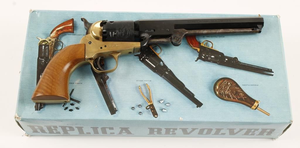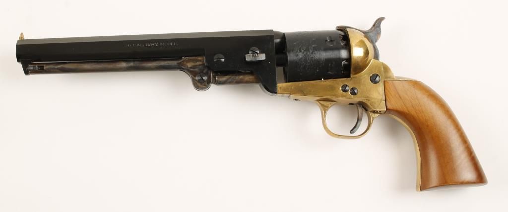Replica black powder single action 6-shot percussion pistol. Blued 7-1/2" octagon barrel. Case colored loading lever, hammer and trigger. Blued and roll-stamped cylinder showing a naval engagement. Brass frame, trigger guard and backstrap. Not cut for a shoulder stock. Includes factory box. Condition is excellent. *Antique Firearm*