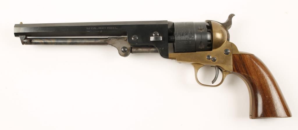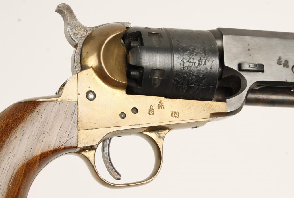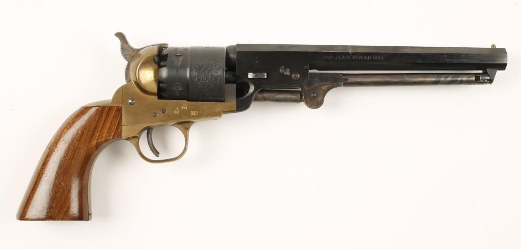Replica black powder single action 6-shot pistol. 7-1/2" blued barrel. Case colored loading lever, hammer and trigger. Blued engraved cylinder showing a naval engagement. Brass frame, trigger guard and backstrap. Not milled for shoulder stock. Condition is good plus. *Antique Firearm*