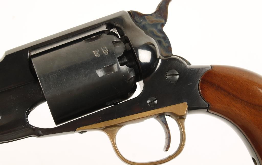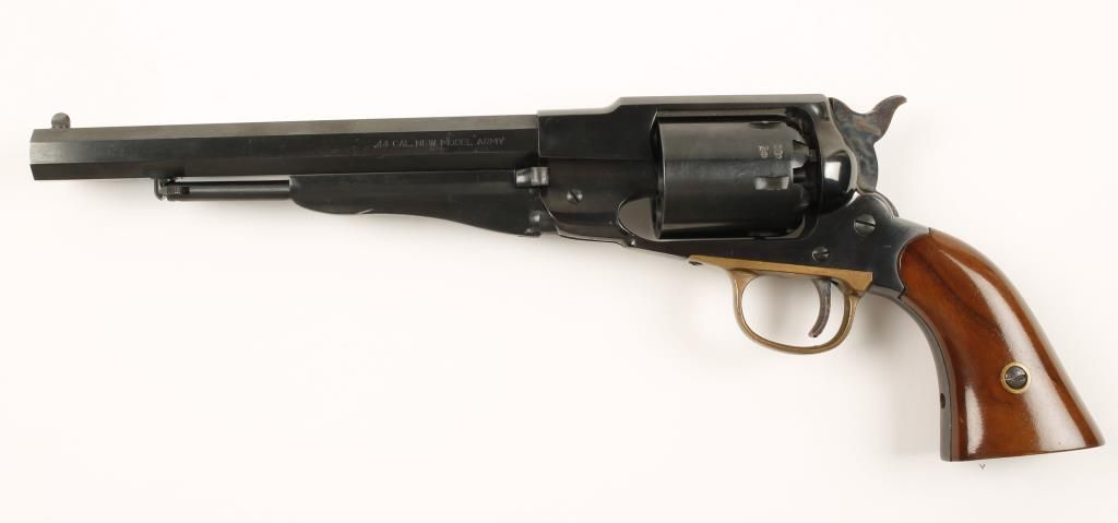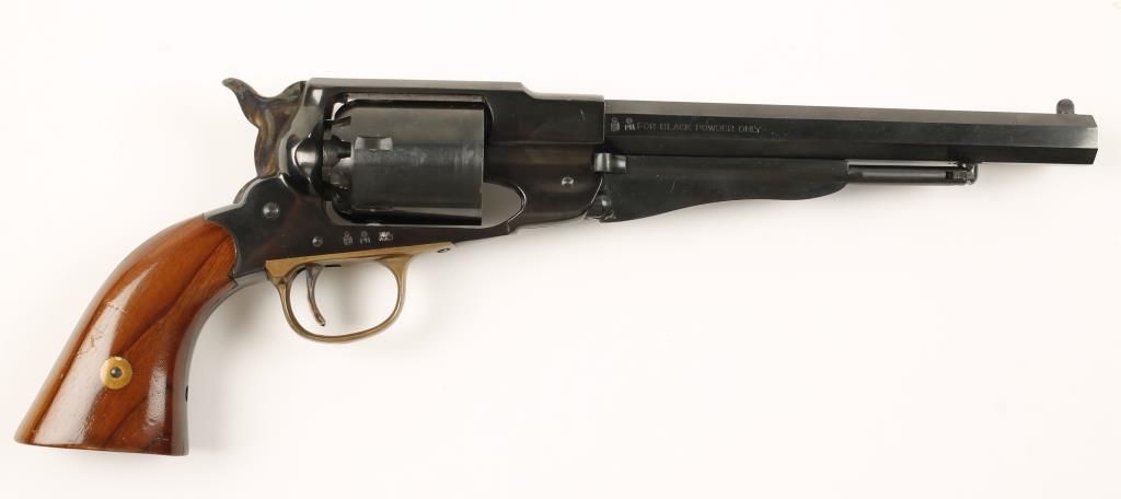 Replica black powder single action 6-shot pistol. 8" blued octagon barrel. Blued loading lever, frame, and cylinder. Brass trigger guard. Color cased hammer and trigger. Not milled for shoulder stock. Condition is very good with few blemishes. *Antique Firearm*