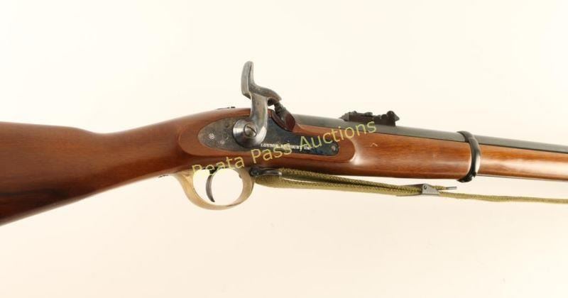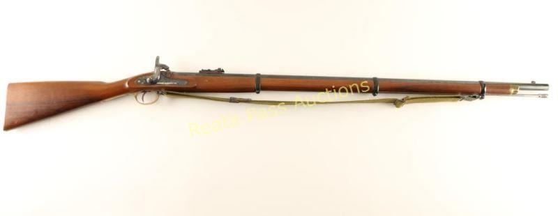 SN: 0900 Finely crafted Italian reproduction of the London Armory Co. P1853 pattern percussion musket chambered for .58 Cal ammunition with 3 1/2 drams of black powder, circa 1987. Features a blued 38" barrel with three bands, patridge front sight on raised base, graduated rear ladder sight, steel ram rod, case hardened lock, green canvas sling, brass furniture, rounded trigger, checkered hammer spur, and full-length smooth European walnut straight grip stock. Rifle exhibits approximately 96% of outs original finish showing very little wear and a few light handling marks\losses. Action is sound, bore appear clear and wood stock is near fine showing small scattered blemishes. Condition is near excellent. ***Antique Firearm***