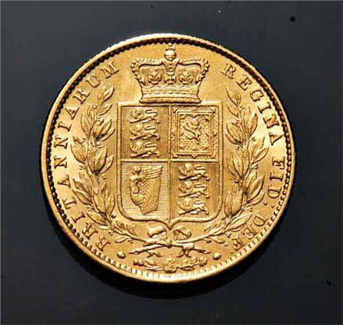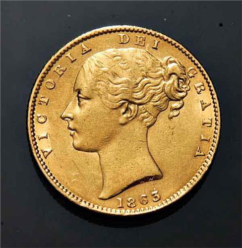 Europa - Gran Bretagna - Vittoria (1837-1901) - Sterlina 1863 - Metallo: Au - Zecca: Londra - Diritto: effigie giovanile della Regina a sinistra - Rovescio: stemma coronato fra due rami di alloro annodati alla base - Di buona qualità
