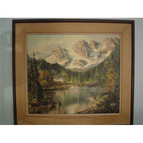 European School (20th.c) In the manner of Ivan Fedorovich Choultse (Russian 1877-1932) Very detailed Alpine landscape with cabin. Wilderness lanscape. Oil on canvas & measures 23"x27.5". Very good condition with a 1/2" professionally repaired tear that can only be seen on back of painting as shown in pictures. Old distressed frame.
