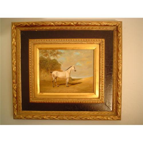 English School (20th.c) Oil on panel & measures 8"x9.25". White horse with black mane. Unsigned in ornate black & gilt wood frame. Very good condition. Originally purchased from "Gallery 24 Antiques" in Manhattan, N.Y. Card attached to back of painting shows price tag of $1,ooo.