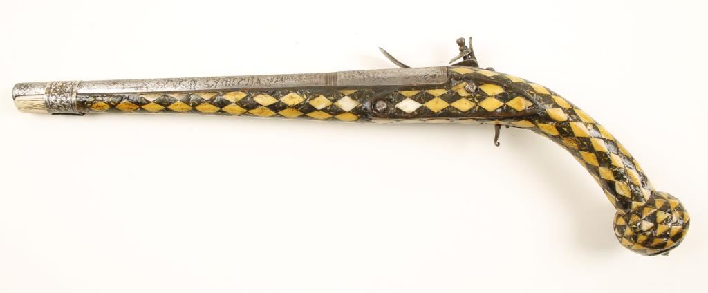 with a European lock and barrel with a Middle Eastern stock with inlaid diamond shaped bone pieces. Unknown caliber, no serial number. The barrel has some foreign writing with a eagle inside of a box etched engraved. The butt of the gun has mother of pearl inlaid into it. Condition Fair as it is antique. The barrel and lock show surface rust. Unknown action or bore. *Antique Firearm*