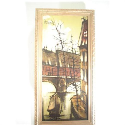 Mille Francoise Seignobosc 20th.c (French) Signed Francoise, upper left. Beautiful French cityscape in the manner of Buffet. Impressionest oil on board. 36"x16" in excellent condition. Listed artist.