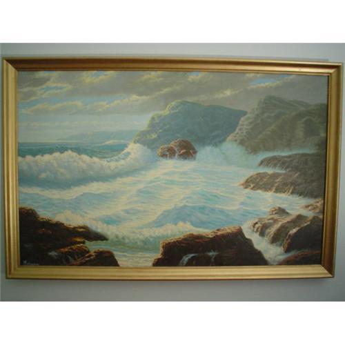 R. Santos Molinero (Spain 20th.c) Beautiful ocean scene of crashing waves. Oil on canvas in a gold wood frame. Excellent condition & measures 30.5"x47". Signed L/L Molinero. Also signed en verso with the location of Valenzuela, Spain.