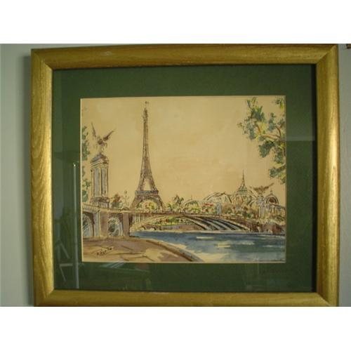 Watercolor of the Eiffel Tower signed Rosette. Fine vintage European study of Pont Alexandre III, Le Grand Palais & the Eiffel Tower. Framed & matted in very good condition with some discoloration to the paper. Measures 9"x11".