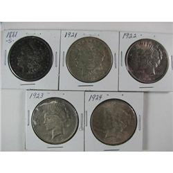 5 Coin Asst US Morgan/Peace Dollars, Asst Dates/Grades 1881 - 1921 - 1922 - 1923 - 1924