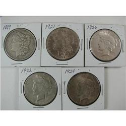 5 Coin Asst US Morgan/Peace Dollars, Asst Dates/Grades 1889 - 1921 - 1922 - 1924 - 1926