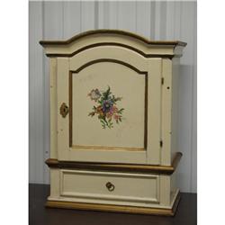 Painted Hanging Cupboard. Origin: Denmark, Ca. 1860. White painted hanging kitchen cupboard with floral hand painted door. 33 H x 25 1/4 W x 15 D. Con