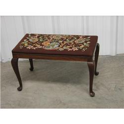 Needlepoint Piano Bench. Origin: England, ca. 1900. Floral Needlepoint on brown background on oak base with Queen Anne legs. 16 1/2 H x 29 W x 16 D. C