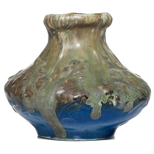 European Art Pottery vase, squat form with molded organic design covered with a green, brown and blue crystalline drip, unknown mark,5in.h