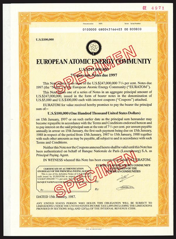 Luxembourg, $100,000 Specimen 7 3/4% Bond in Vertical format with all Coupons attached. Black print with orange border and under print. No vignette, but the Agency logo is at top center of certificate. Red SPECIMEN overprints, VF-XF condition, SC-USBNC.