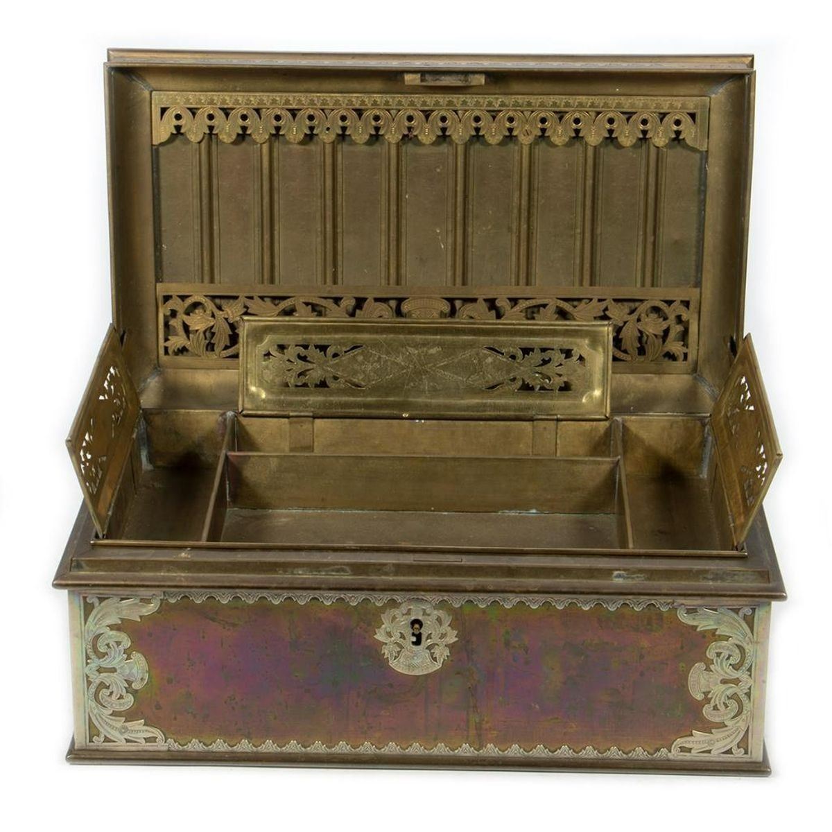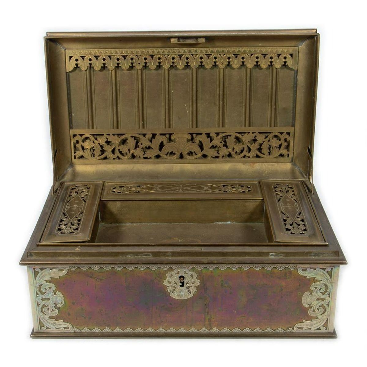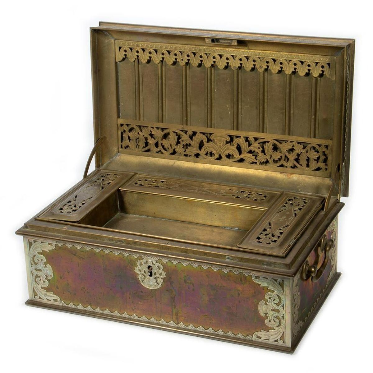 The handled chest with applied scrolling embellishments, opening to reveal a sectioned storage area on the lid, and a tray with three hinged lidded compartments. 10 3/4in. x 18 1/4in. x 7 1/8in. Condition: Some scratches, wear, tarnishing. No key present.