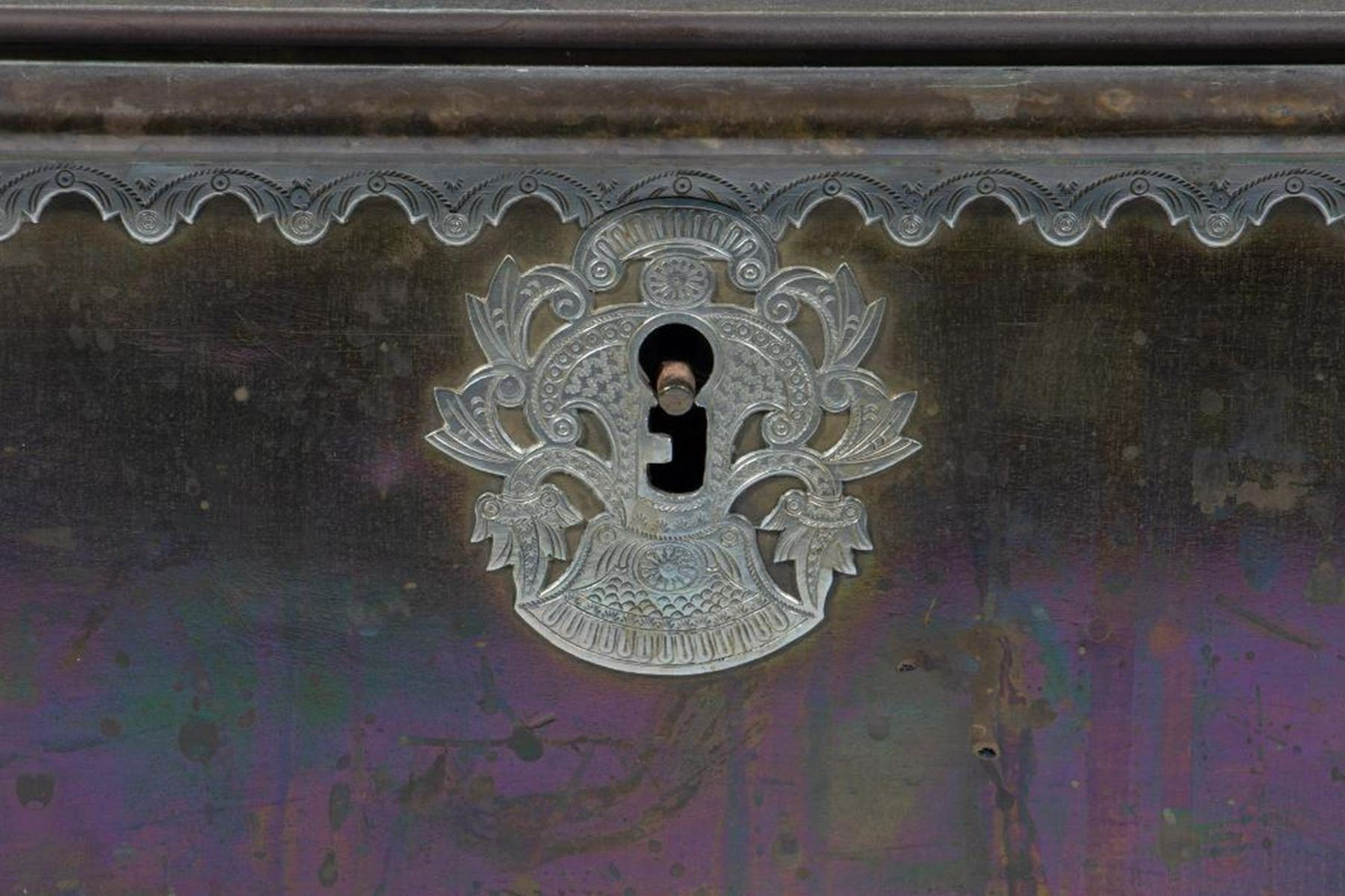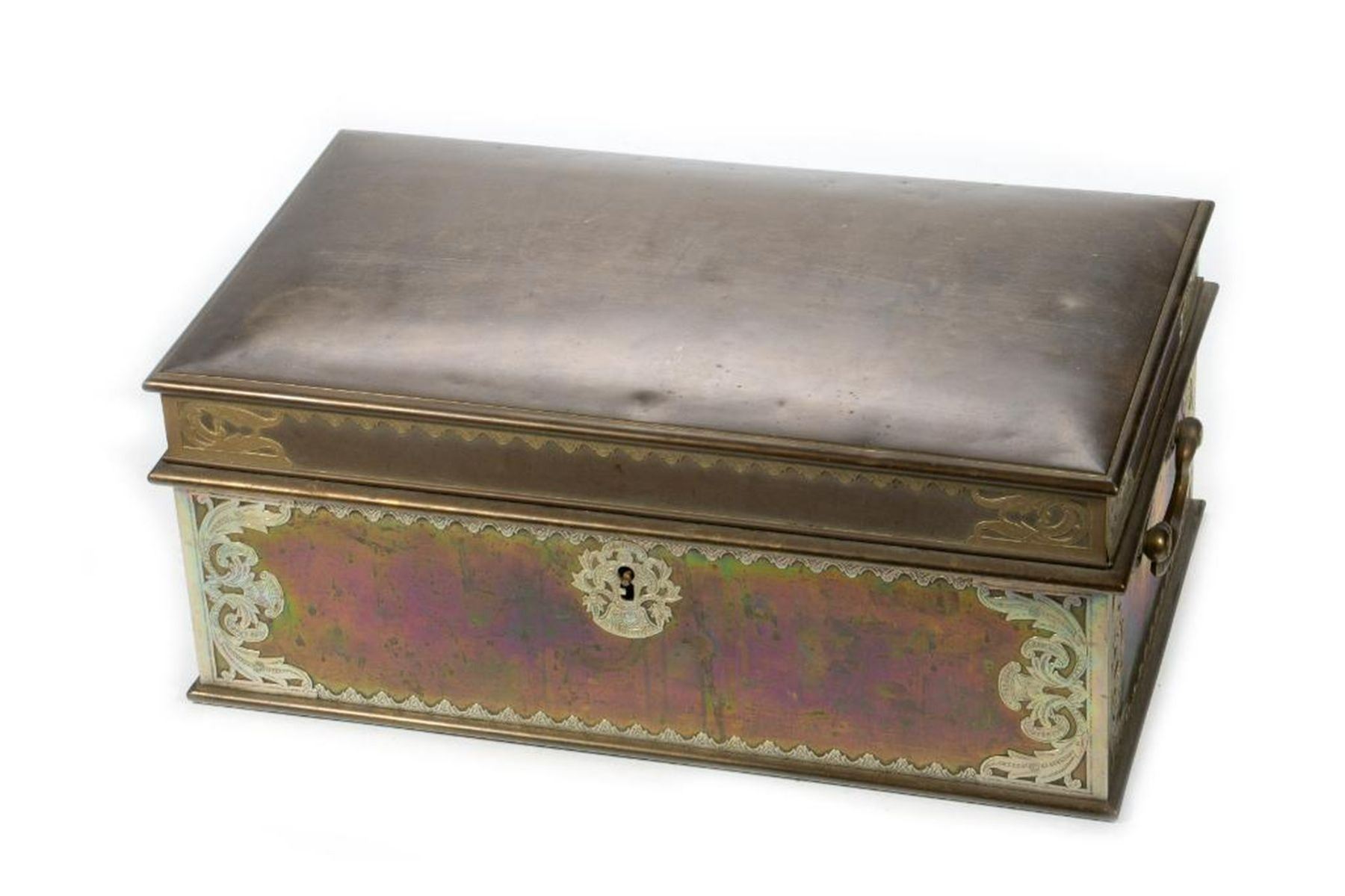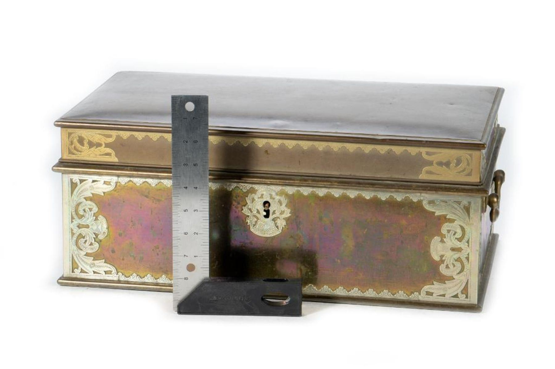 The handled chest with applied scrolling embellishments, opening to reveal a sectioned storage area on the lid, and a tray with three hinged lidded compartments. 10 3/4in. x 18 1/4in. x 7 1/8in. Condition: Some scratches, wear, tarnishing. No key present.
