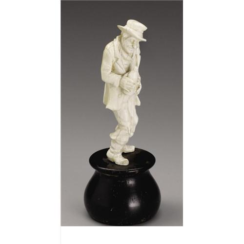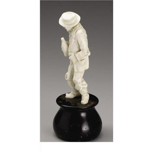<B>A European Carved Ivory Figure</B></I><BR><BR>Unknown maker, Continental<BR>Twentieth Century<BR>Ivory and wood<BR>Unmarked<BR>4.18 in. high<BR><BR>A drunkard in tattered and patched attire, holding a bottle, carved wood plinth<BR>1 <BR><BR><B>Condition Report:</B> Usual minor wear and small old repair
